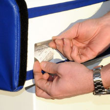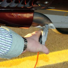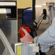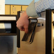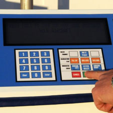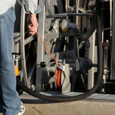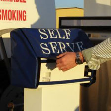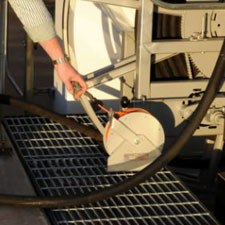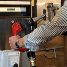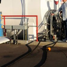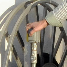 Place nozzle back in receptacle and turn dispenser off (this will cause the receipt to print). Press the "rewind" button next to hose reel. Hose will automatically guide itself back onto the reel. Stop when the ball stop reaches the reel. Return ground cable to its reel by pulling on it until it retracts- guide it back by hand.