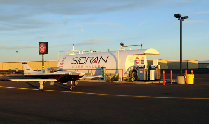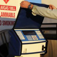 Turn dispenser on by flipping lever over - this will turn on the pump. Dispense fuel into aircraft fuel tanks. There is a ladder at the site if needed for high-wing aircraft. Large red numbers read out gallons dispensed and can be seen from the aircraft.