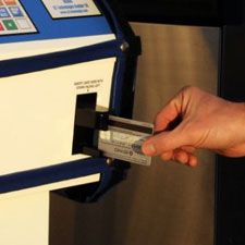 Open cover on credit card terminal and insert card with magnetic stripe facing left. Follow instructions on screen.